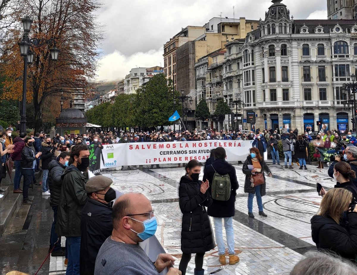 Concentración de hosteleros en Oviedo para reclamar un cambio en las condiciones de reapertura del sector en Asturias, previsto para el 14 de diciembre. - EUROPA PRESS