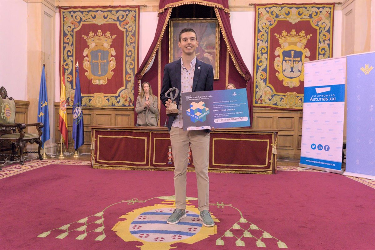 El estudiante David Otero Vallina fue reconocido este año con el galardón. Recibió de manos del vicerrector de Planificación Estratégica y Coordinación de Campus, Juan Carlos San Pedro, un cheque de 1.000 euros y una escultura acreditativa realizada por estudiantes de la Escuela de Arte de Oviedo.