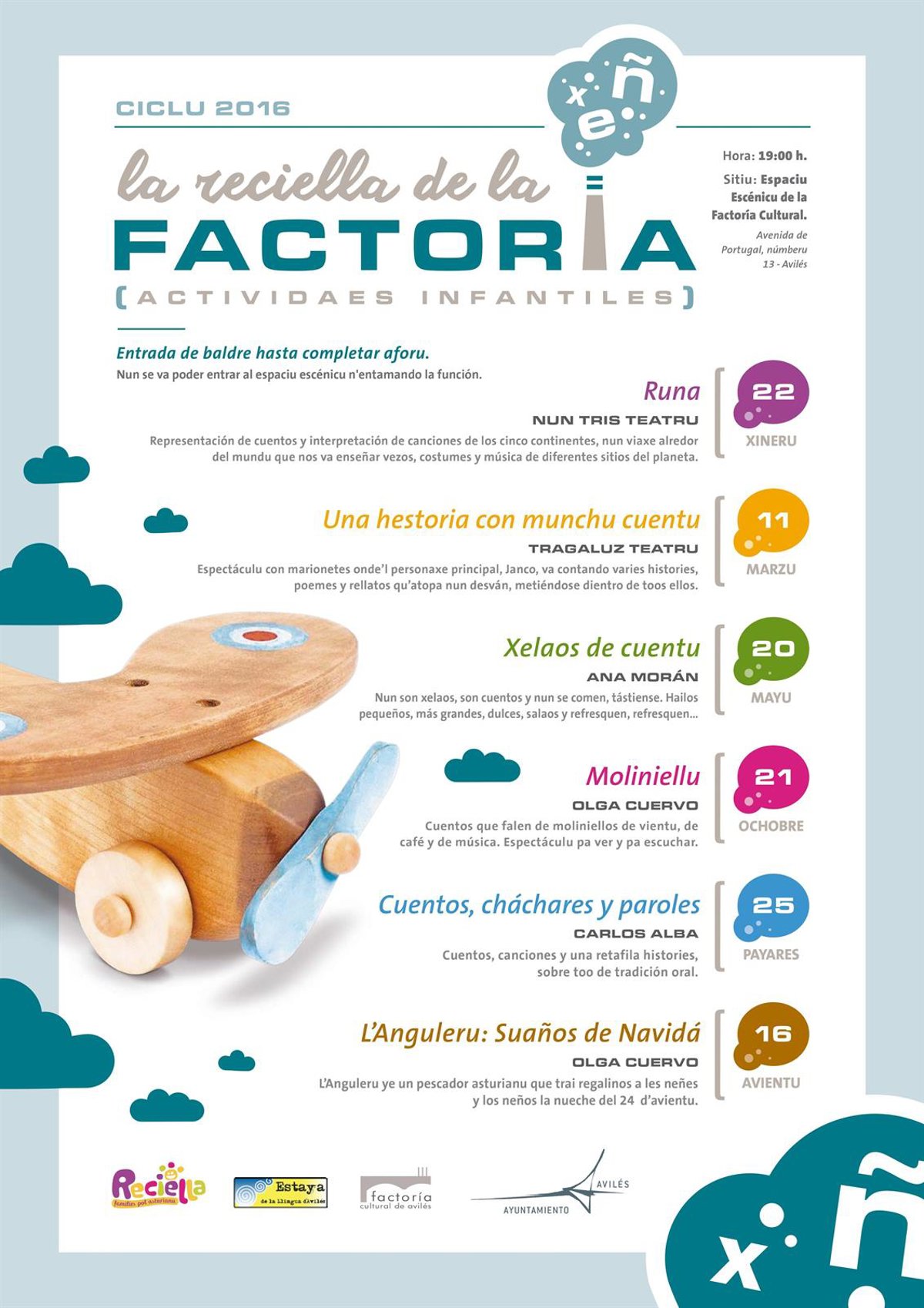 Las que resten las son siguientes: 11 de marzo. "Una historia con munchu cuentu", de Tragaluz Teatro. Un espectáculo de marionetas donde el personaje principal, Janco, va contando algunas historias, poemas y relatos que encuentra en un desván, metiéndose dentro de todos ellos; 20 de mayo. "Helados de cuento" con Ana Morán. No son helados, son cuentos y no se comen, se degustan. Los hay pequeños, más grandes, dulces, salados refresquen, refrescan...; 21 de octubre. "Moliniellu" con Olga Cuervo. Cuentos que hablen de molinillos de viento, de café y de música. Un espectáculo para ver y escuchar; 25 de noviembre. "Cuentos, cháchares y paroles" con Carlos Alba. Cuentos, canciones y una serie de historias, sobre todo de tradición oral; 16 de noviembre. "L'Anguleru: Suaños de Navidá" con Olga Cuervo. L'Anguleru es un pescador asturiano que lleva regalos a los niños y las niñas en la noche del 24 de noviembre.
