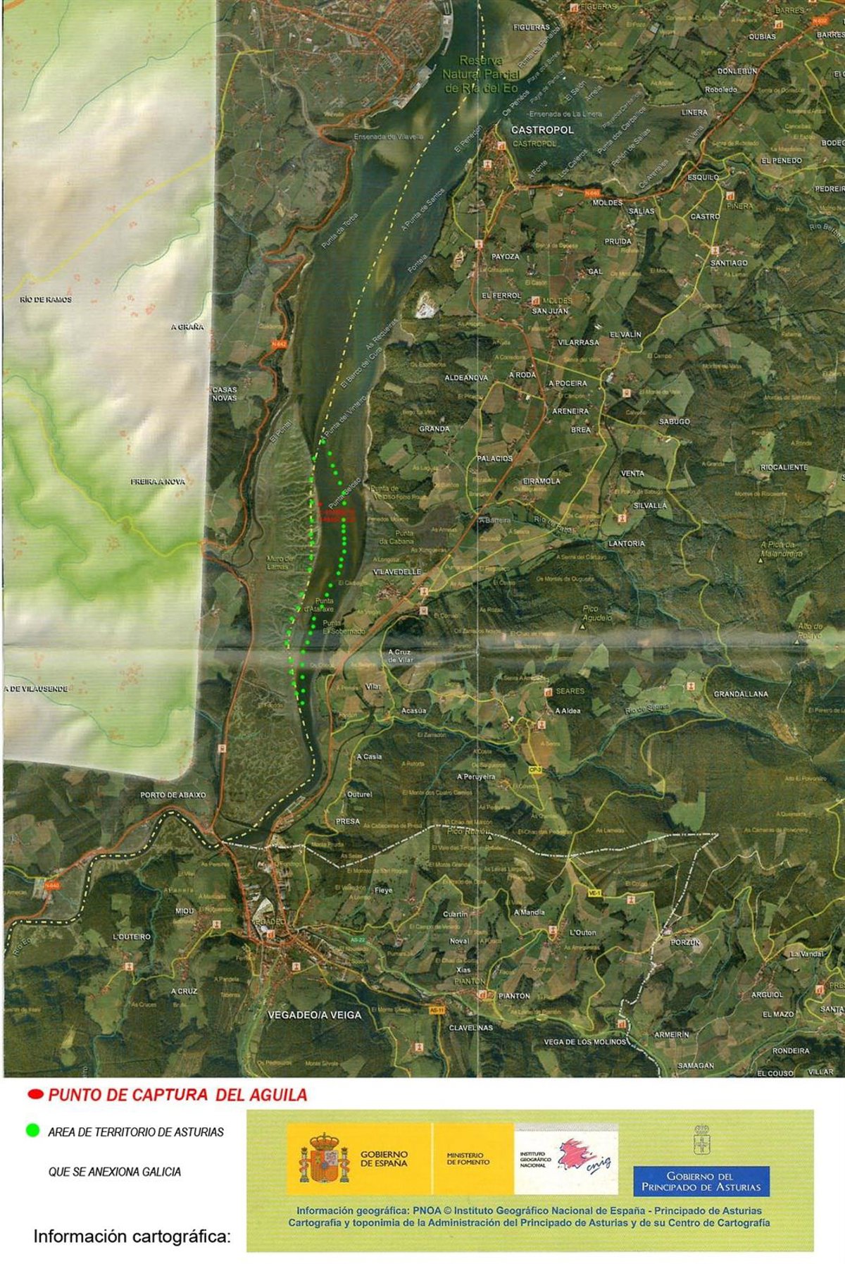 Para ello, La Junta de Galicia defiende como territorio gallego una parte de la Ría del Eo de aproximadamente unas 100 hectáreas de superficie, que según el FAPAS el Instituto Nacional de Cartografía, órgano dependiente del Ministerio de Fomento y que posee las competencias a nivel Nacional en material cartográfica deja de manera patente en los mapas oficiales que pertenecen a Asturias.