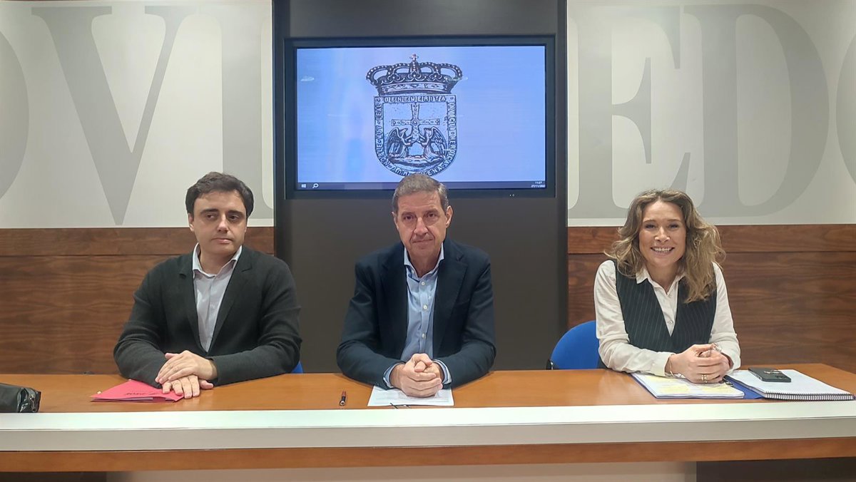 Archivo - El portavoz del PSOE, Carlos Fernández Llaneza, y los ediles Sonia Fidalgo y Javier Ballina en rueda de prensa. - EUROPA PRESS - Archivo
