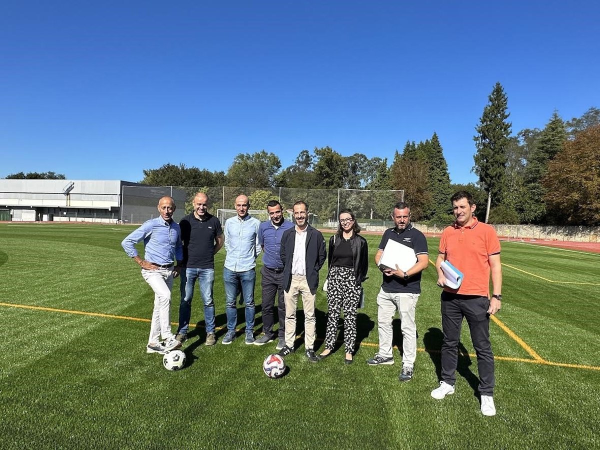 El alcalde de Siero, Ángel García, y el concejal de Deportes, Jesús Abad, han visitado este mediodía la finalización de las obras de renovación del césped artificial y la red de riego del campo de fútbol de Santa Bárbara, en Lugones.