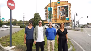 El alcalde de Siero, Ángel García, y la concejala de Educación, Juventud e Igualdad, Eva Iglesias, a la finalización de las labores de pintura del tercer mural del programa Muralia 2025. En esta ocasión, se ha realizado en la fachada del edificio Cuatro Vías, ubicado en la N-634 en El Berrón. Los encargados de esta obra ha sido la Crew de artistas Nikita 5.7, que plasmaron un tigre selvático en 3D. La actuación ha contado con un plazo de ejecución de una semana.