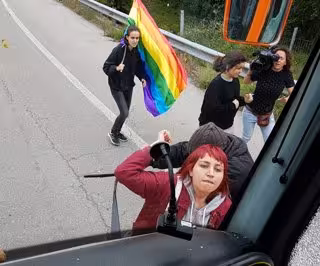Este último, además de llamarles "fachas de mierda" y decirles "sois vosotros los que imponéis mierda", cogió adoquines que lanzó al bus. Varias personas de ese colectivo violento se subieron a unos vehículos y comenzaron a seguir al autobús.