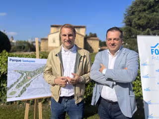 El candidato de Foro Oviedo a la alcaldía de la capital asturiana, Carlos Suárez, y el secretario general y candidato de Foro Asturias a la Presidencia del Principado, Adrián Pumares, han presentado este miércoles frente a la basílica de Santullano el proyecto 'Parque Santuyano' un nuevo espacio verde que transformará la entrada a Oviedo desde la autopista 'Y' protegiendo a su vez a la Iglesia del prerrománico asturiano.
