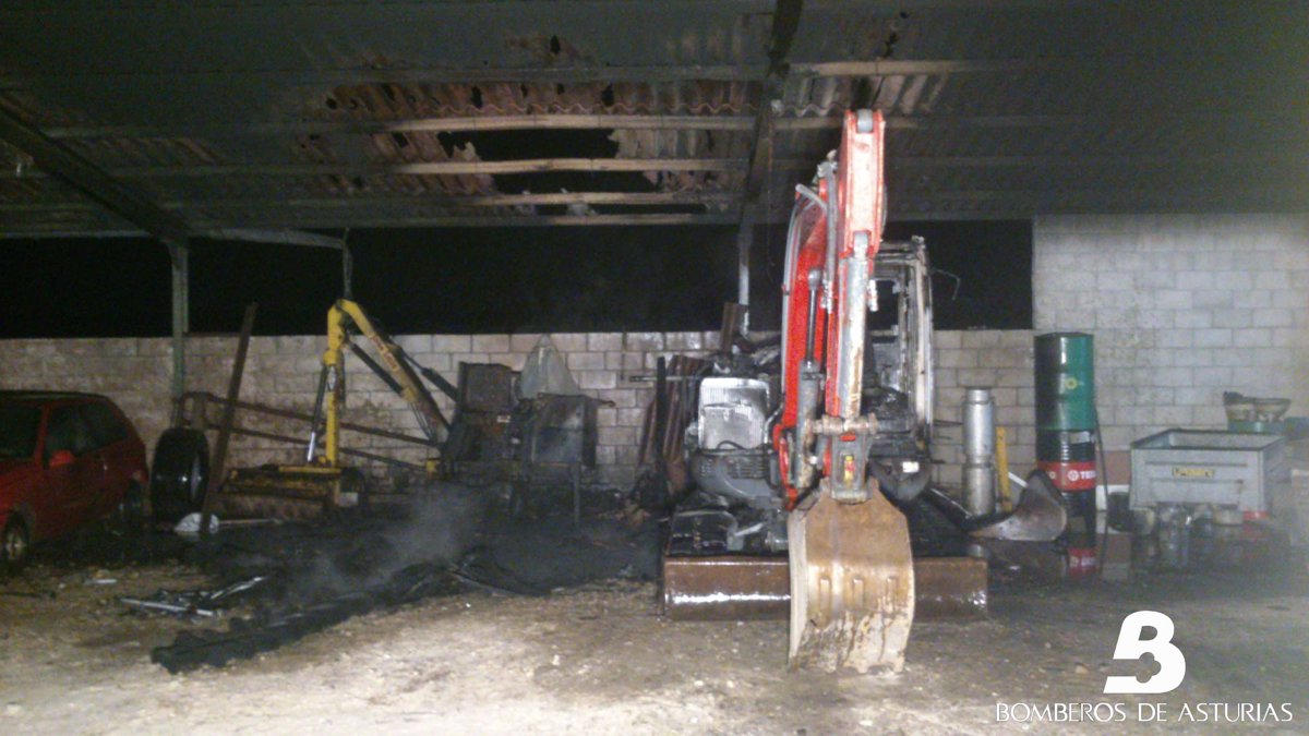 Según ha informado este domingo el 112-Asturias, el fuego quemó una mini excavadora, una desbrozadora y parte de la cubierta de uralita de la instalación.