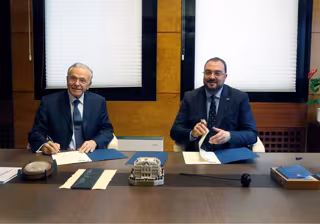 El presidente de la Fundación 'la Caixa', Isidro Fainé y el presidente del Principado, Adrián Barbón, firman el convenio de colaboración. - GOBIERNO DE ASTURIAS