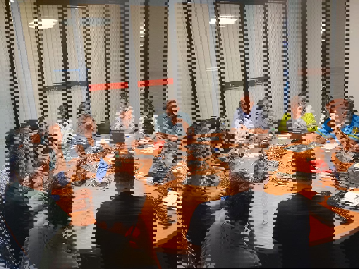 El consejero de Movilidad, Medio Ambiente y Gestión de Emergencias, Alejandro Calvo (en el centro de la imagen, de blanco), junto al resto de autoridades y personal que integra la reunión de seguimiento del estado de los incendios, celebrada en La Morgal. - PRINCIPADO