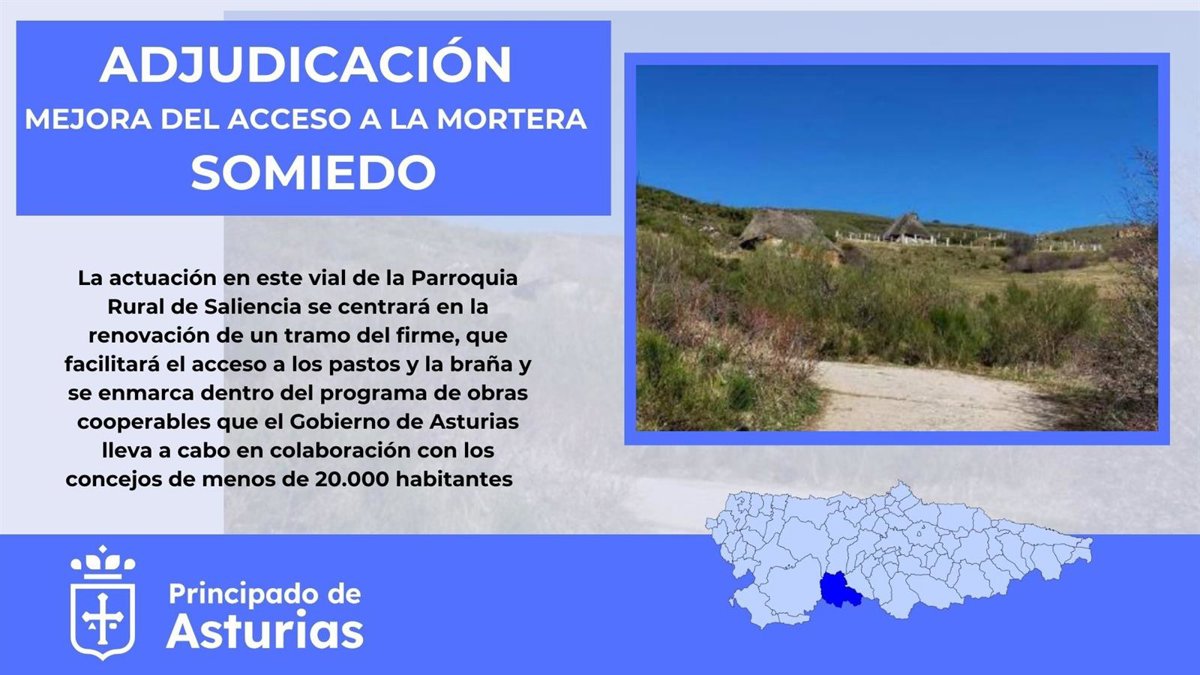 La Consejería de Fomento, Cooperación Local y Prevención de Incendios ha adjudicado a la empresa Sogerner SDS S.L. las obras de mejora del acceso a La Mortera, una braña situada en la parroquia rural de Saliencia, en Somiedo. Los trabajos tienen un plazo de ejecución de un mes y suponen una inversión de 5.566 euros.