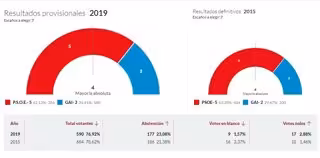 En el municipio de Grandas de Salime, con el 100 por ciento escrutado, el partido más votado en las elecciones municipales es el PSOE con el 62,13 por ciento de votos y 5 concejales, seguido por la Agrupación Independiente de Grandaleses (GAI), que ha logrado un 31,41 por ciento y 2 concejales.