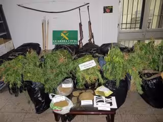 A continuación la Guardia Civil procedió a la incautación de la plantación que arroja un total de 70 plantas de marihuana con un peso en verde de 71,300 kilogramos, dos armas largas (carabinas) y un arco de fabricación casera junto con diez flechas de madera con una punta de diez centímetros de hierro.