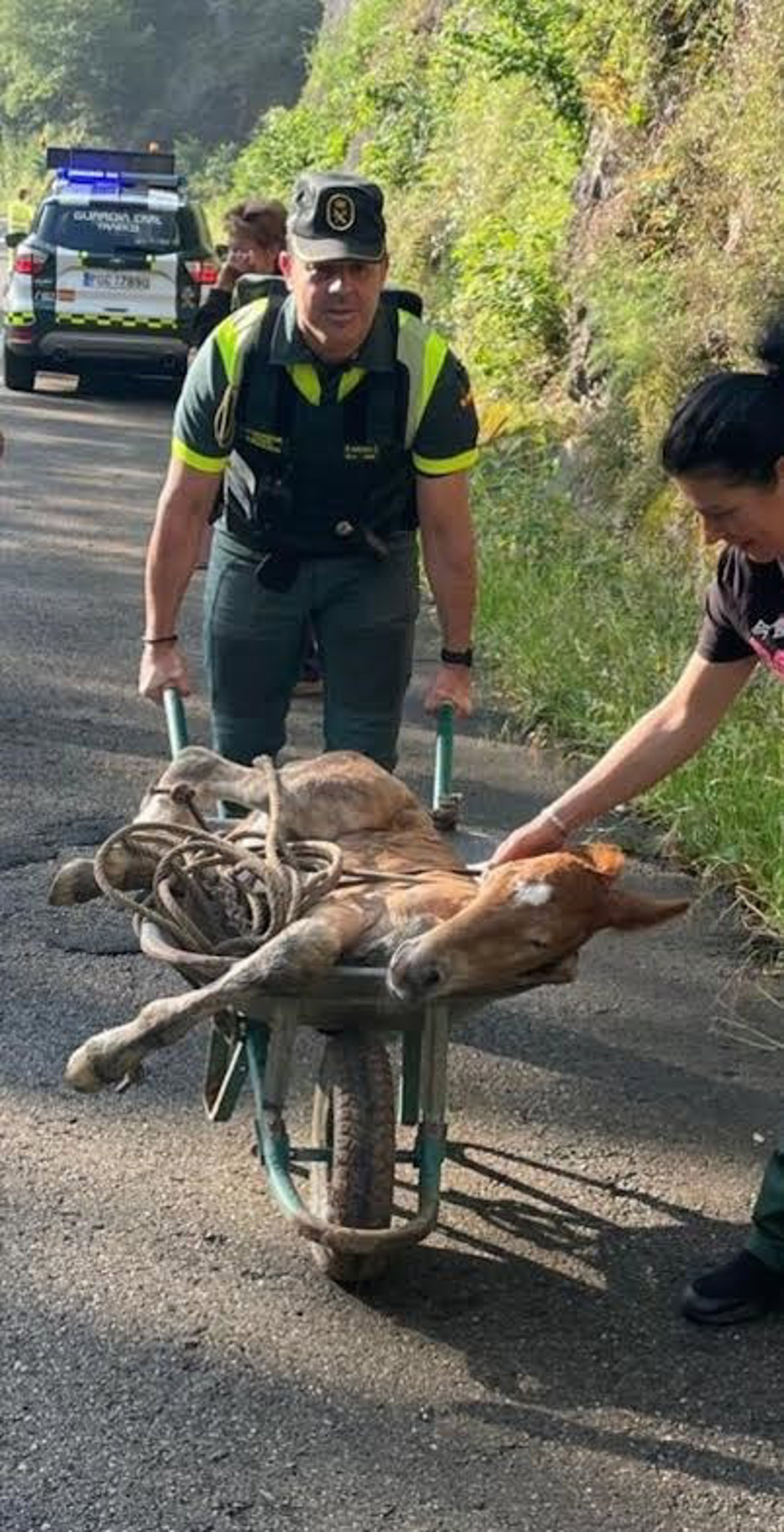 Según ha informado la Guardia Civil este lunes a través d euna nota de prensa, tras sacarlo del arcén, le ayudaron a dar sus primeros pasos, y una vez localizado el propietario, que desconocía que su yegua había parido esa madrugada, ayudaron a trasladar al animal en un carretillo durante casi cuatro kilómetros para que se reuniese con su madre.