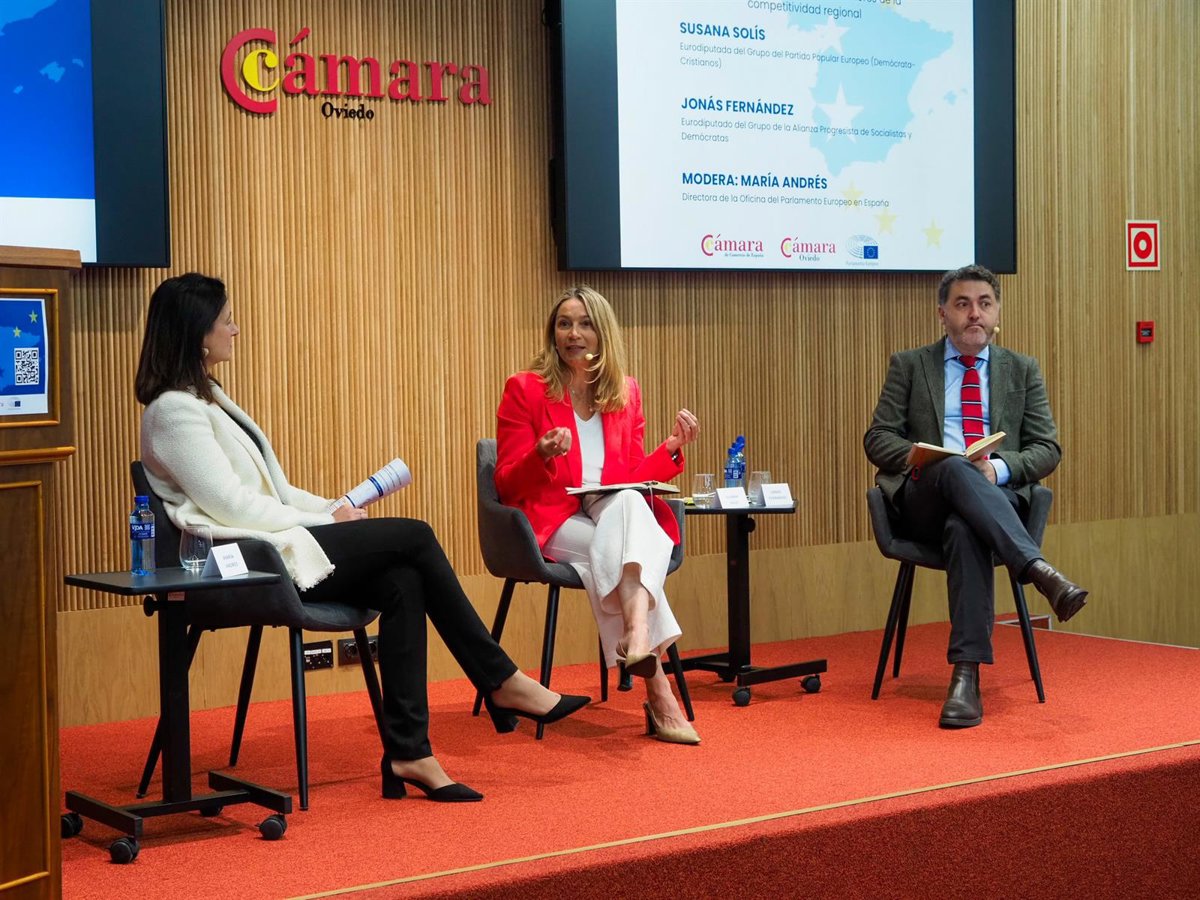 La Oficina del Parlamento Europeo en España ha organizado este viernes en la Cámara de Comercio de Oviedo una jornada sobre las oportunidades de la financiación europea en Asturias en la que han paticipado los eurodiputados asturianos, Susana Solís (PP) y Jonás Fernández (PSOE), y en la que se han referido al momento "crítico" que atraviesa Europa debido a la guerra arancelaria desatada por el presidente de EEUU, Donald Trump.