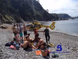 El Centro de Coordinación de Emergencias del 112-Asturias recibió el aviso de que a un varón, que estaba en la playa, le había caído una piedra en la cabeza. De inmediato se movilizó al Grupo de Rescate de Bomberos de Asturias, a bordo del helicóptero medicalizado de la entidad.
