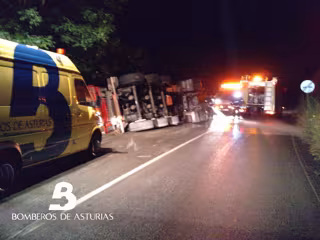 El Centro de Coordinación de Emergencias del 112-Asturias recibió el aviso a las 21.54 horas del martes. En la llamada indicaban que un camión se había salido de la vía y la cabina estaba colgando de un desnivel de unos 20 metros. Señalaban que la caja del camión se encontraba en la vía de comunicación y que en su interior había una persona que estaba herida y atrapada. El conductor se encontraba sujeto por el cinturón de seguridad y además no podía liberar las piernas.