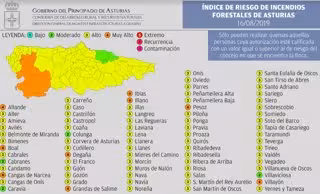 Los municipios en los que el índice es 'muy alto' se circunscriben al suroccidente asturiano. Así, el mayor riesgo de incendio se dará en Allande, Boal, Cangas del Narcea, Degaña, Grandas de Salime, Ibias, Illano, Pesoz y Villayón.