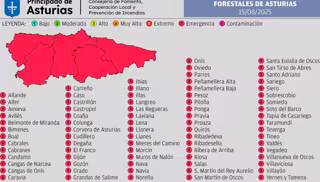 El Gobierno del Principado de Asturias ha distribuido la previsión con el índice de riesgo por incendios forestales para este viernes, en el que figura como 'extremo' en los 78 municipios de la comunidad autónoma.