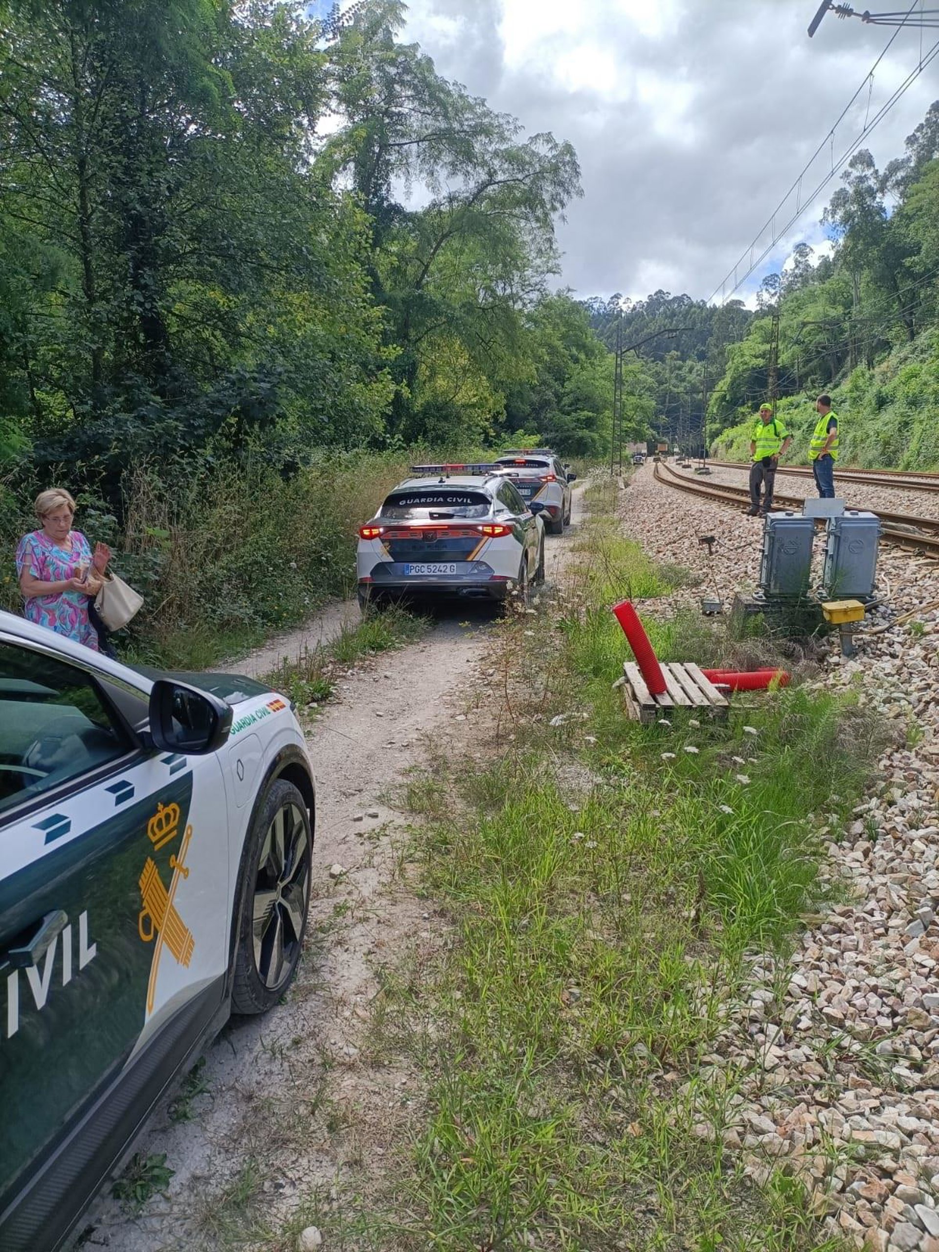 Coches de la Guardia Civil trasladan a pasajeros de un tren de cercanías que sufrió una incidencia en la línea Gijón-El Berrón. - GUARDIA CIVIL