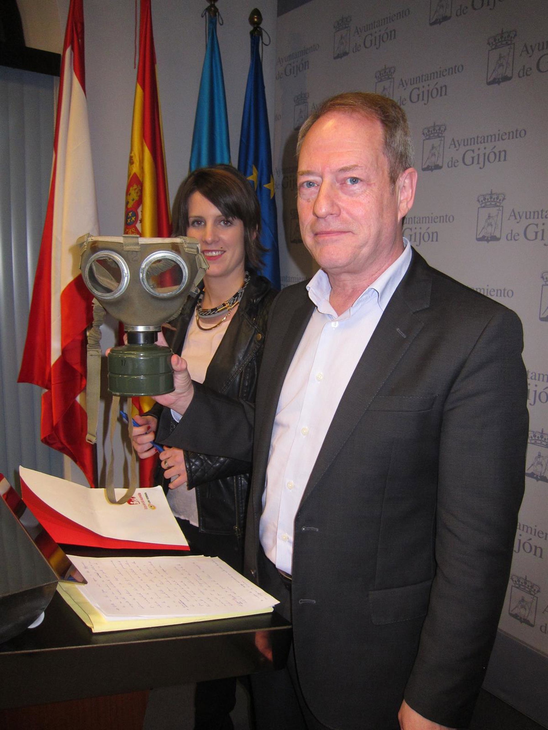 Martín, que ha comparecido en rueda de prensa acompañado de la edil gijonesa de IU Rosa Libertad Bueno, ha mostrado una máscara de oxígeno militar para escenificar que es lo que van a tener que sufrir en los próximos años los gijoneses si no hay un cambio de actitud y en las políticas medioambientales tanto del Gobierno local como regional.