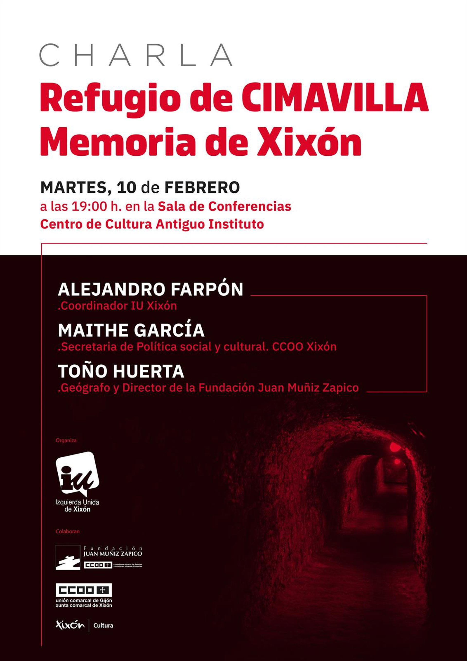 La conferencia correrá a cargo de Alejandro Farpón, coordinador y concejal de IU Gijón; Maithe García, secretaria de Política Social y Cultural de Comisiones Obreras; y Toño Huerta, director de la Fundación Juan Muñiz Zapico, geógrafo y responsable del estudio sobre la recuperación de los refugios antiaéreos en la ciudad.