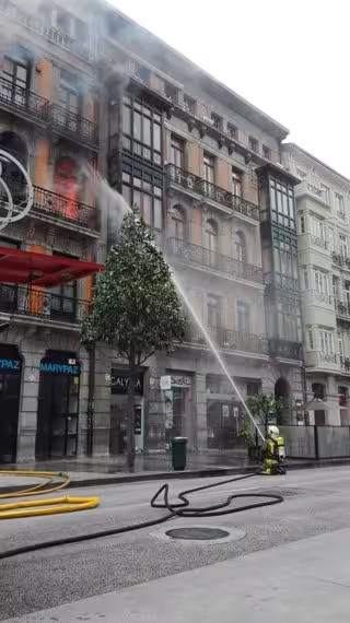 La Policía ha desalojado todo el edificio y, pese al espectacular incendio, no hay ninguna persona afectada. Los establecimientos de los bajos comerciales están cerrados por seguridad. El humo sale de la segunda y tercera planta y también por la calle Melquiades Álvarez número 25, porque los edificios están conectados.