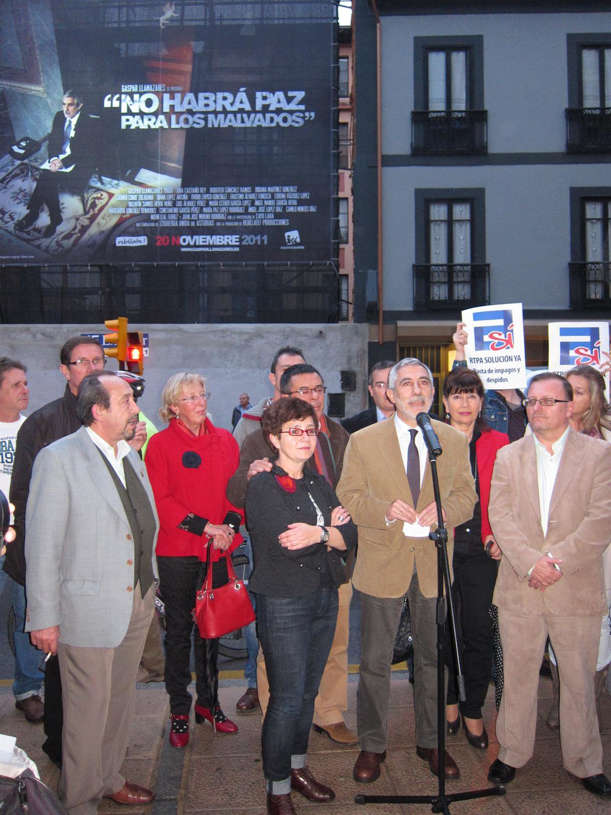 Tras el acto, Llamazares ha mostrado su apoyo a los trabajadores de la RTPA y ha participado en la pegada de carteles de estos en señal de protesta por los recortes del Principado a la radio televisión pública asturiana.