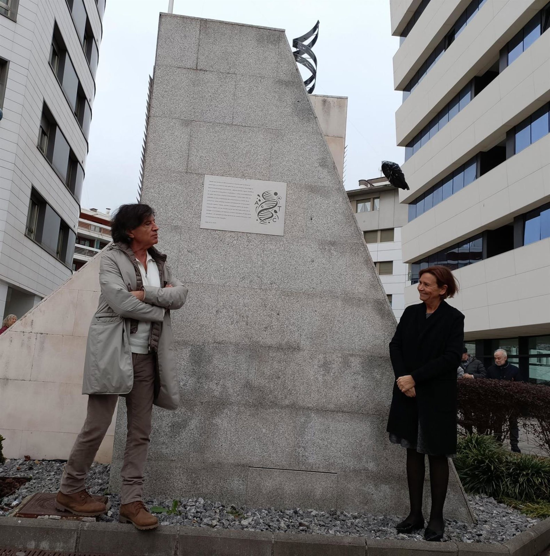 El catedrático de Bioquímica y Biología Molecular en la Universidad de Oviedo, Carlos López Otín, junto a la alcaldesa de Gijón, Carmen Moriyón, tras el descubrimiento de las placas y escultura en homenaje al profesor. - EUROPA PRESS