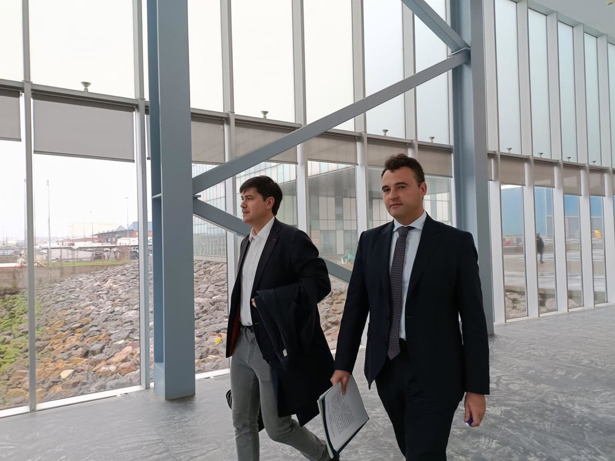 El consejero de Hacienda, Justicia y Asuntos Europeos del Principado de Asturias, Guillermo Peláez, junto al consejero de Ciencia, Industria y Empleo, Borja Sánchez, en el puerto gijonés de El Musel. - EUROPA PRESS