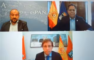 Los alcaldes de Madrid y Oviedo, José Luis Martínez-Almeida y Alfredo Canteli y el periodista de La Nueva España, Álvaro Faes. - CAPTURA WEBINAR PRENSA IBÉRICA