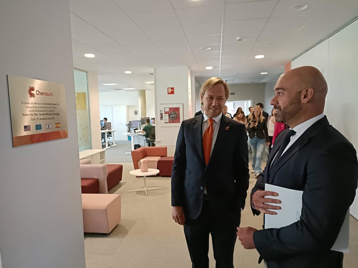 El concejal de Urbanismo del Ayuntamiento gijonés, Jesús Martínez Salvador, junto al líder de Chemours en España, José Olay, en el décimo aniversario de la compañía, en sus instalaciones de Gijón. - EUROPA PRESS