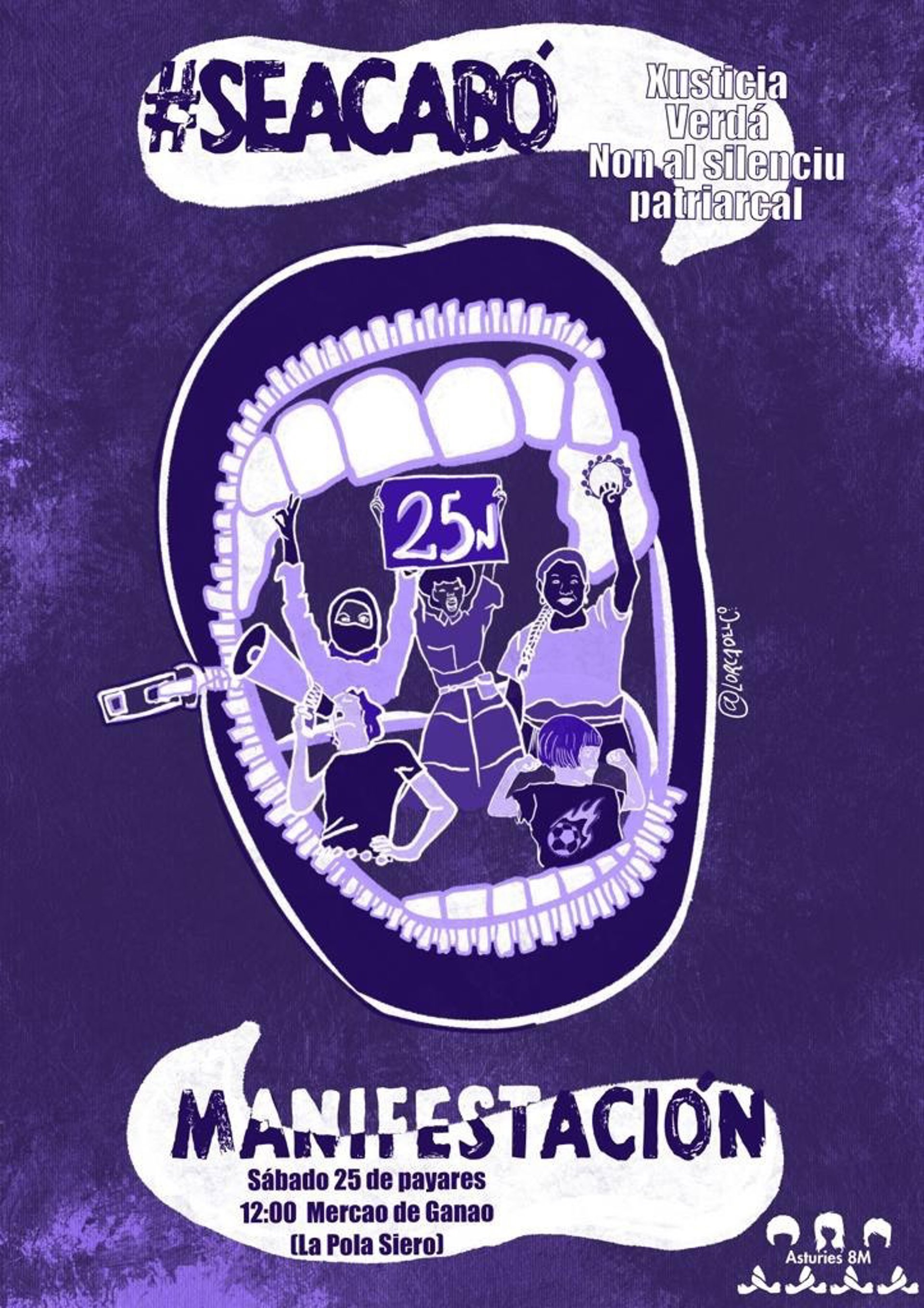 En concreto, la manifestación en Asturias por el 25N será este sábado, a las 12.00 horas, en La Pola organizada por el colectivo Asturies Feminista 8M y con salida del Mercado Nacional de Ganado. El lema de la convocatoria es 'Se acabó: xusticia, verdá, non al silenciu patriarcal'.