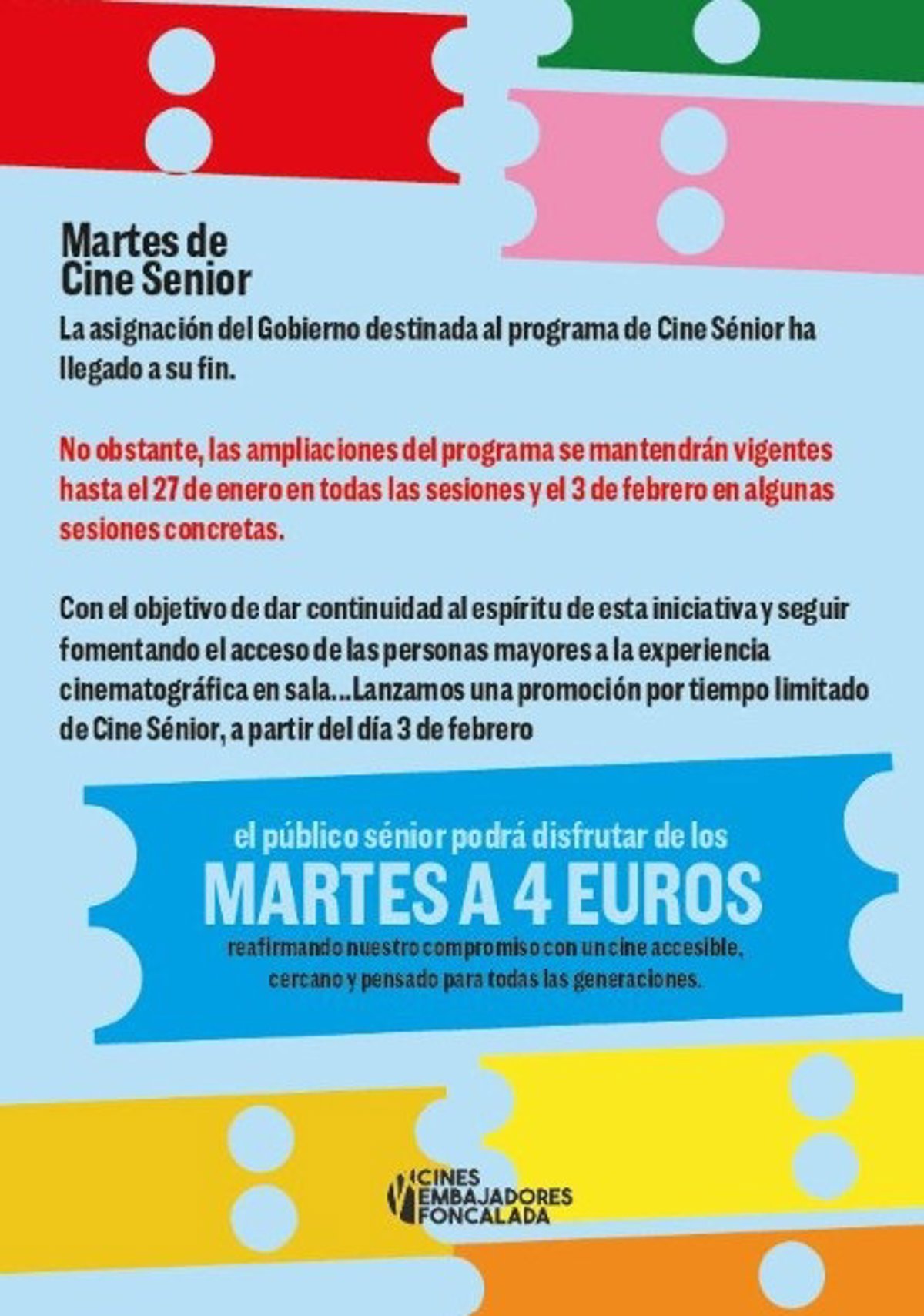 Los Cines Embajadores Foncalada de Oviedo mantendrán entradas a precio reducido para mayores de 65 años todos los martes, a 4 euros, una vez finalice el programa estatal de Cine Sénior promovido por el Gobierno.