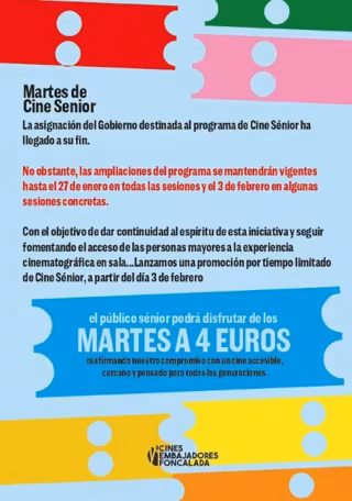 El programa concluye oficialmente el martes 27 de enero y se extenderá solo a algunas sesiones del 3 de febrero, última fecha prevista. A partir de ese día, las personas mayores podrán seguir beneficiándose del descuento en el propio cine ovetense, que busca así dar continuidad a la iniciativa y "reafirmar su compromiso con un cine accesible", según informó la dirección de Embajadores Foncalada.