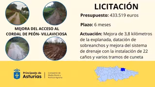 La Consejería de Medio Rural y Política Agraria ha sacado a licitación las obras de mejora de la pista de acceso al Cordal de Peón, en Villaviciosa, con un presupuesto de 433.519 euros. Las empresas interesadas pueden presentar sus propuestas hasta el 26 de agosto.