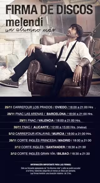 25 noviembre - Carrefour Los Prados - Oviedo26 noviembre - El Corte Inglés Princesa - Madrid28 noviembre - Fnac Las Arenas - Barcelona29 noviembre - Fnac Valencia30 noviembre - Fnac Alicante02 diciembre - El Corte Inglés Santander03 diciembre - El Corte Inglés Gran Vía - Bilbao05 diciembre - Carrefour Atalayas - Murcia