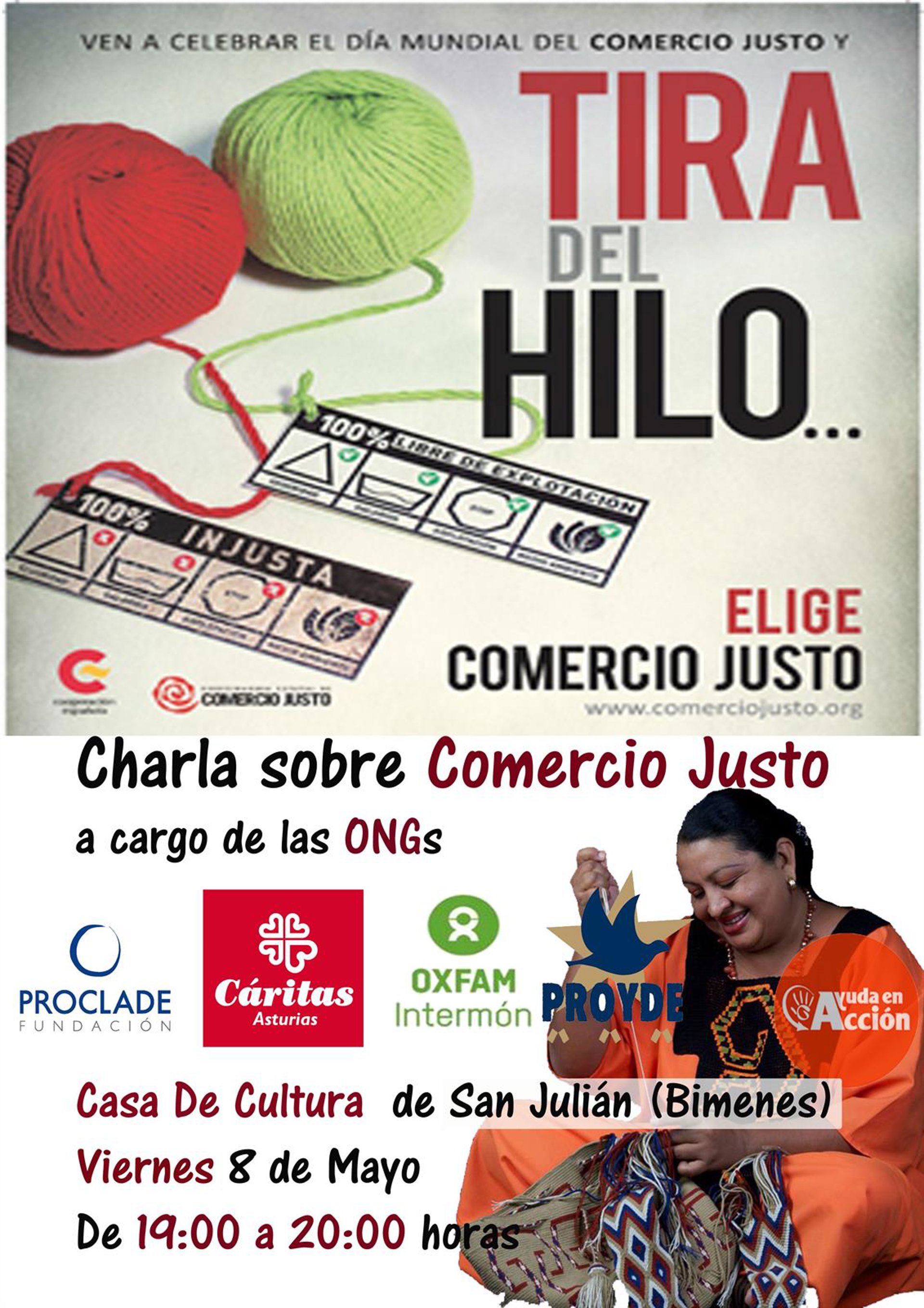 Las ONGs asturianas Cáritas Asturias, Ayuda en Acción, Intermon Oxfam, Proyde y Proclade se unen este sábado 9 de mayo a la celebración del Día Mundial del Comercio Justo. En el Principado las actividades tendrán lugar en San Julián de Bimenes, en el marco del Mercau Yerbatu y bajo el lema 'Tira del hilo' se explicará la realidad que hay detrás del mercado textil.