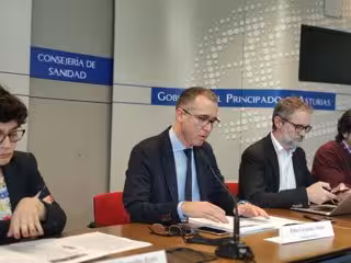 El consejero de Salud, Pablo Muñiz, informa en rueda de prensa de la evolución del coronavirus en Asturias, junto a Rafael Cofiño, Concepción Saavedra e Ismael Huerta. - EUROPA PRESS
