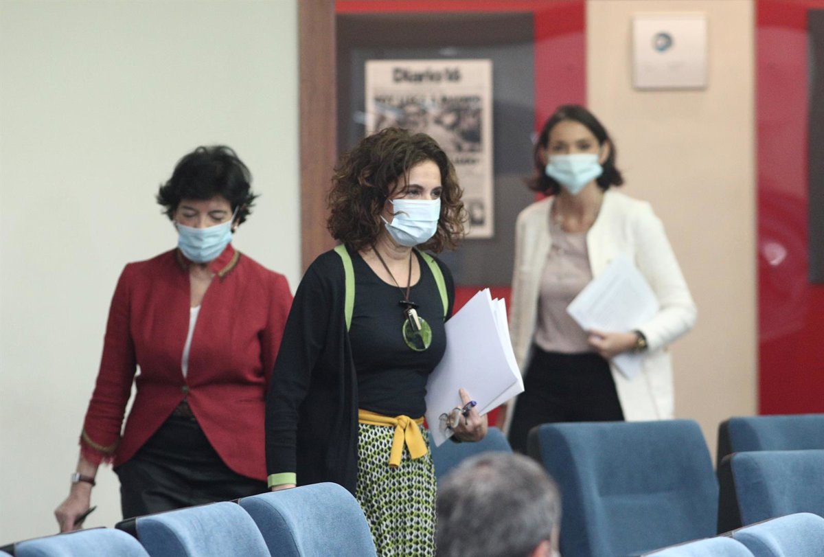 (Delante-Atrás) La ministra portavoz y de Hacienda, María Jesús Montero; la ministra de Educación y Formación Profesional, Isabel Celaá. y la ministra de Industria, Comercio y Turismo, Reyes Maroto; en rueda de prensa posterior al Consejo de Ministros. - EUROPA PRESS/E. Parra. POOL - Europa Press