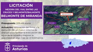 La Consejería de Movilidad, Medio Ambiente y Gestión de Emergencias ha licitado la reforma del vial que une Las Cruces con Belmonte, en el concejo de Belmonte de Miranda, por 209.466 euros. Las empresas interesadas podrán presentar sus ofertas hasta el día 15 de abril.