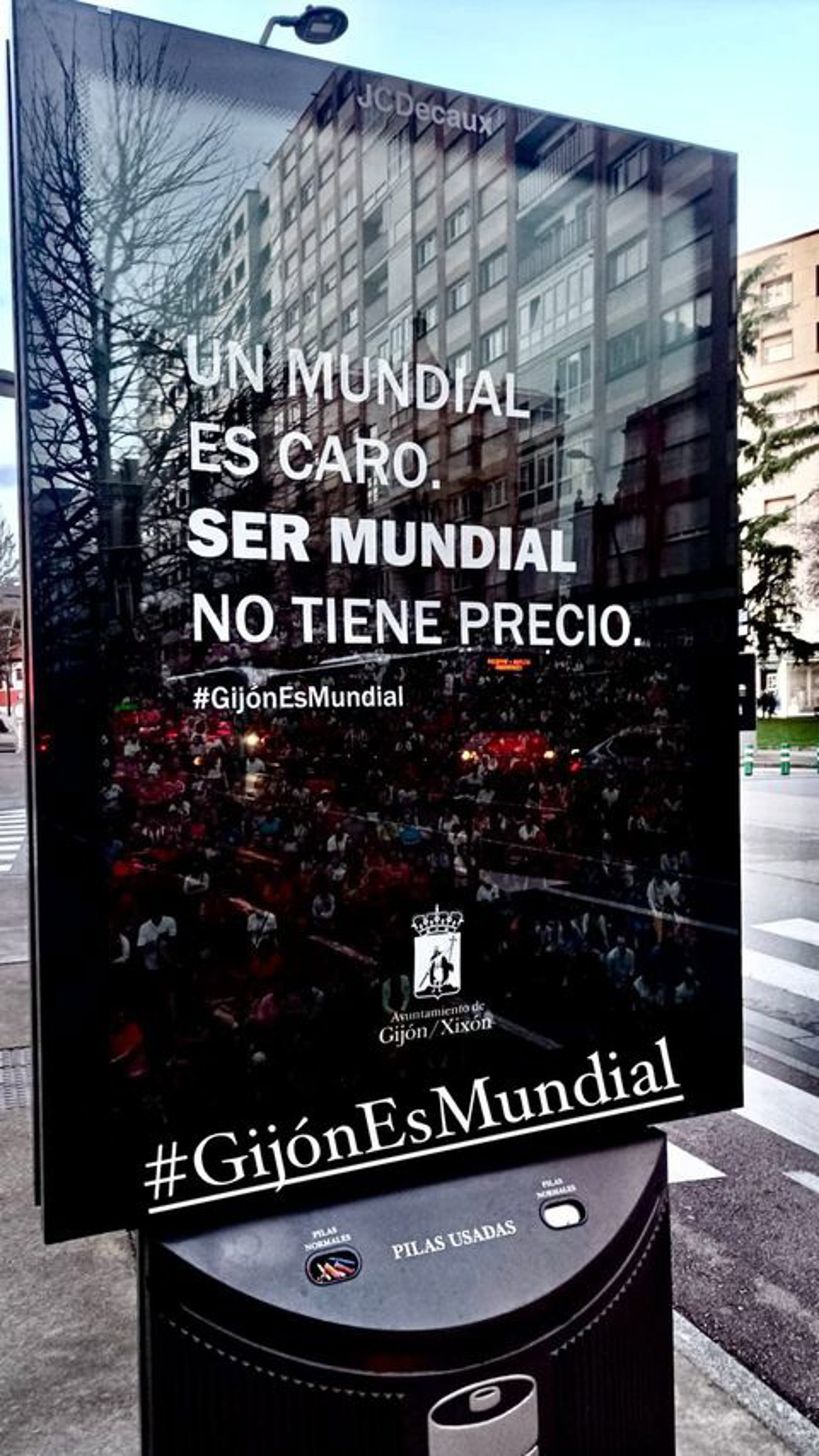 "Un Mundial es caro. Ser mundial no tiene precio", reza el mensaje de la cartelería que se ha dispuesto en 38 mupis de diferentes puntos de la ciudad, han confirmado a Europa Press desde el Consistorio gijonés. Con ello se quiere reivindicar el propio valor que tiene Gijón y que puede tener un futuro más allá de acoger o no un Mundial.