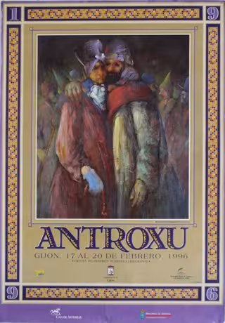 Se trata de la obra titulada 'Máscaras' (oleo sobre lienzo, 65 x 54 cm.), que se utilizó como imagen del cartel anunciador del Antroxu de Gijón" de 1996. La imagen muestra a dos personajes disfrazados, que posan en un primer plano rodeados por un grupo de personas enmascaradas.