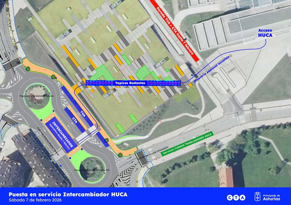 El intercambiador de transporte público del Hospital Universitario Central de Asturias (HUCA) comenzará a funcionar el próximo sábado, día 7 de febrero. La puesta en servicio de este espacio de espera para viajeros implica que las paradas de autobús ubicadas actualmente en la calle Aldea Cerdeño, en el lateral del edifico de Consultas Externas, se trasladen al nuevo equipamiento, situado en la vía Juan Antonio Álvarez Rabanal.