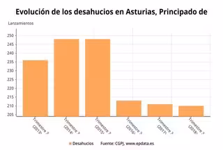 El número de desahucios practicados en el tercer trimestre de 2018 se situó en 210 en el Principado de Asturias, lo que implica un descenso del 0,5 por ciento respecto al mismo trimestre de 2017, según el estudio 'Los efectos de la crisis económica en los órganos judiciales' publicado este lunes por la Sección Estadística del Consejo General del Poder Judicial (CGPJ).