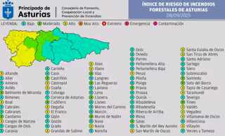 Un total de 21 de los 78 concejos asturianos tendrán este lunes 8 de septiembre un índice 'alto' de riesgo de incendios forestales, según las previsiones del Instituto de Recursos Naturales y Ordenación del Territorio (Indurot). El organismo trabaja con una escala de cinco niveles constituida, de menor a mayor, por las categorías 'bajo', 'moderado', 'alto', 'muy alto' y 'extremo'.