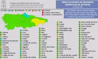 Mientras la mayoría de municipios de la región cuenta con riesgo 'moderado' y en cinco de ellos, Gozón, Carreño, Avilés, Gijón y Corvera el riesgo por incendio es 'bajo'.