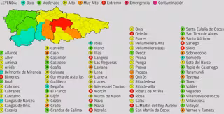 Los concejos con nivel 'extremo' están ubicados en el área central y son los de Bimenes, Langreo, Morcín, Nava, Noreña, Oviedo, Ribera de Arriba, Riosa, San Martín del Rey Aurelio, Sariego y Siero.