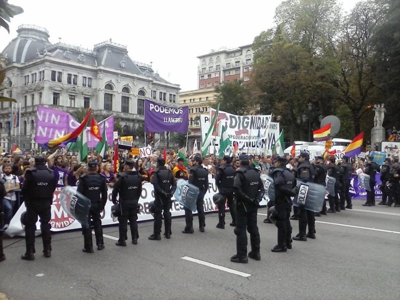 Los organizadores de la manifestación que tiene lugar desde las 17.00 horas en la Plaza de la Escandalera de Oviedo, lugar cercano al teatro donde este viernes se celebra la ceremonia de entrega de los Premios Príncipe de Asturias, han decidido presentar una denuncia al entender vulnerado su derecho a manifestarse.
