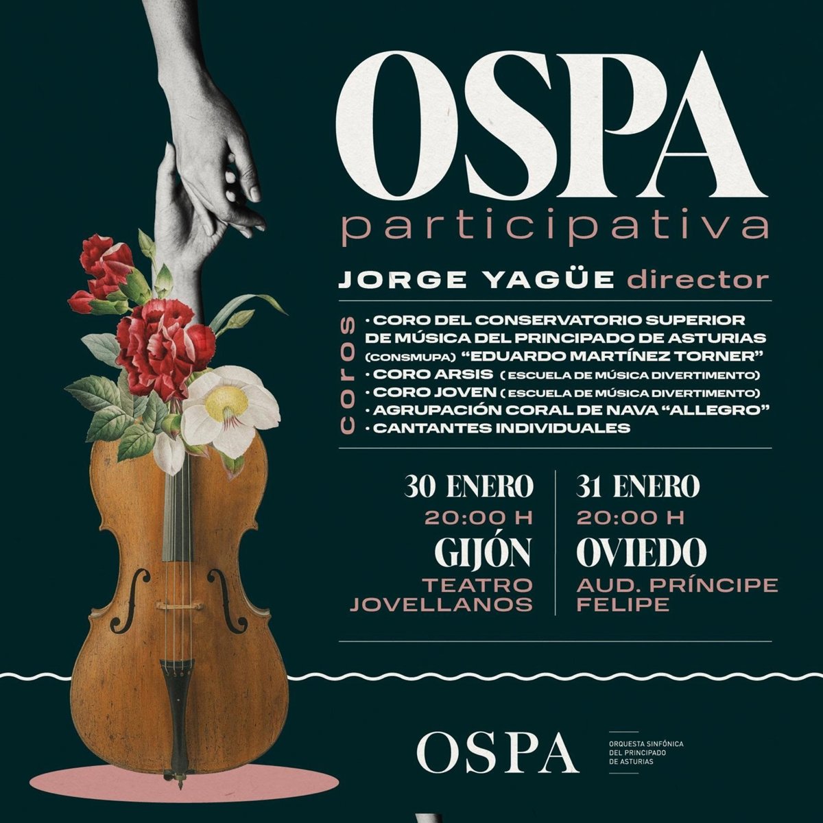 La Orquesta Sinfónica del Principado de Asturias (OSPA) llevará a cabo una nueva edición del programa Ospa Participativa los días 30 y 31 de enero, con el que busca estrechar lazos con la comunidad musical asturiana. Los conciertos serán el martes 30 en el Teatro Jovellanos de Gijón y el miércoles 31 en el Auditorio Príncipe Felipe de Oviedo, ambos a las 20:00 horas. El programa incluirá oberturas y coros de ópera y zarzuela.