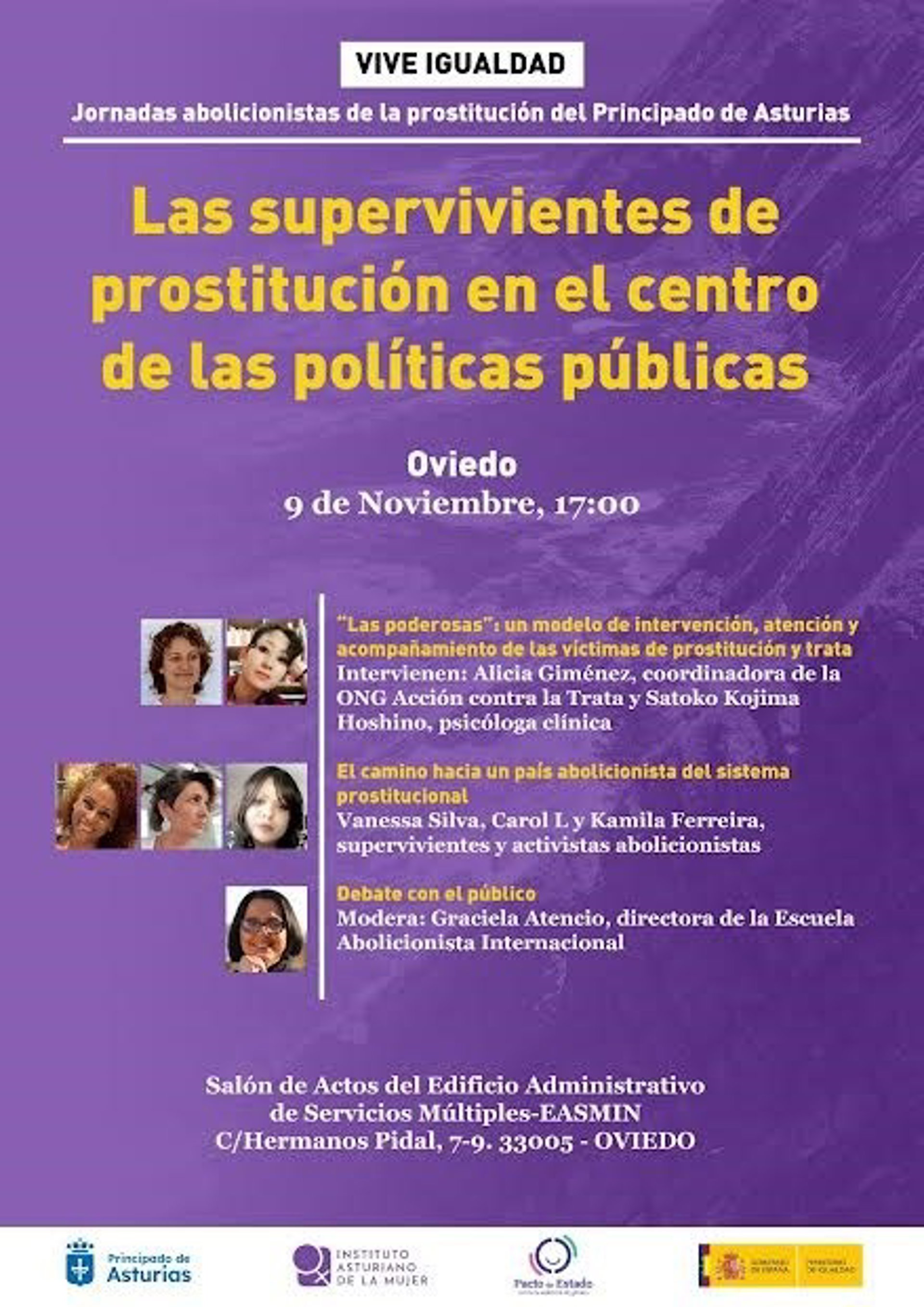 La actividad, que es gratuita y tendrá lugar el 9 de noviembre en el salón de actos del Edificio Administrativo situado en la calle Hermanos Pidal de Oviedo, comenzará a las 17.00 horas con la ponencia 'Las poderosas: un modelo de intervención', atención y acompañamiento de las víctimas de prostitución y trata', de Alicia Giménez y Satoko Kojima Hoshino.