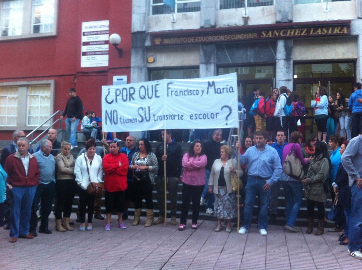 Padres y alumnos del Instituto de Educación Secundaria (IES) Sánchez Lastra de Mieres han protestado este lunes a la puerta del centro contra los recortes de transporte escolar decretados desde la Consejería de Educación, Cultura y Deporte. Las nuevas medidas dejan sin línea a dos alumnos que empiezan el curso de 1º de ESO y que viven en la zona rural del concejo, a más de siete kilómetros de distancia del núcleo urbano.